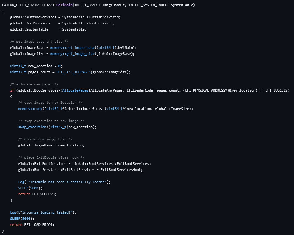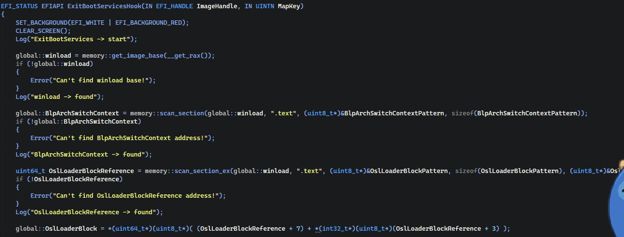 ExitBootServicesHook starts by getting winload.efi base using __get_rax() from rax register (return address).