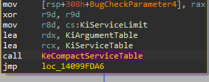 As we can see, on the second reference for KiServiceTable is in KiKernelInitialization and our table is passed to the KeCompactServiceTable function call.