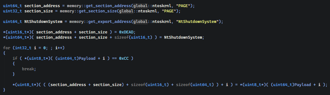 I decided to just copy it to the memory before the function with the signature 0xDEAD to identify the end. We will see later how it will be extracted in the payload function. As we are inside the ntoskrnl, we can just walk to its image base and gets function address from EAT but my solution is more universal.