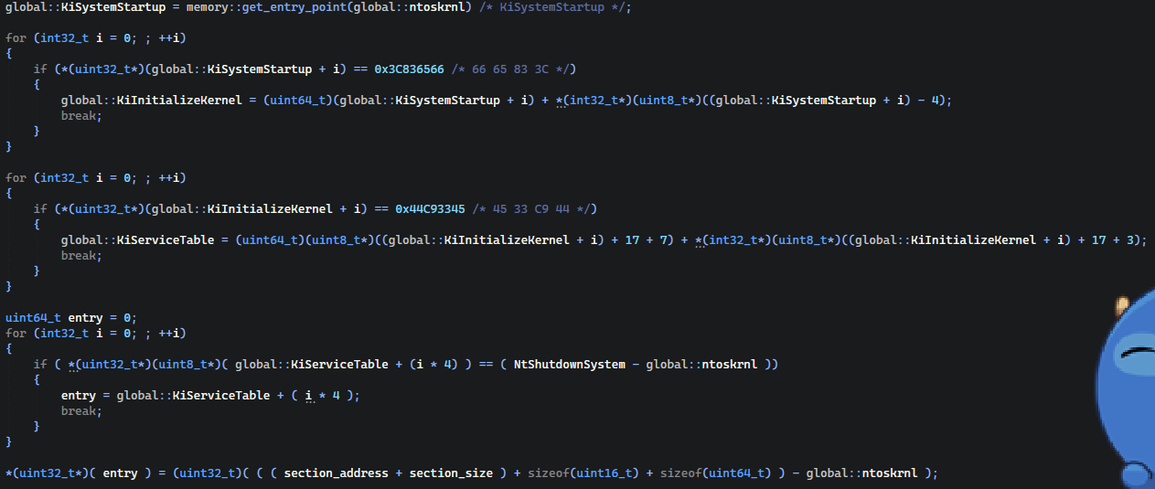 Here we are trying to resolve the KiServiceTable. You might think that we can just use the pattern scan for reference, but the problem is that even on other Windows 10 22H2 builds, the pattern is different, so we will have to manually walk to it from the kernel entry point.