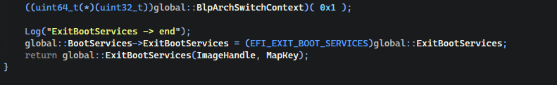 The end of the ExitBootServices is simple, we are just switching our context back to the Firmware, after that restoring our hook and returning the original ExitBootServices function. After the original ExitBootServices function finishes its execution, our driver will be automatically unloaded from memory.