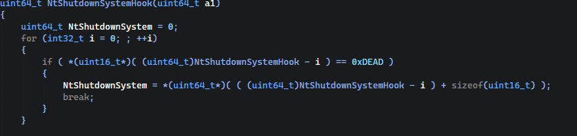 Will back to our payload, first we are going back in memory to get our saved NtShutdownSystem address. After that we will hit our 0xDEAD signature, then we know that we are in the right place and extracting the address.