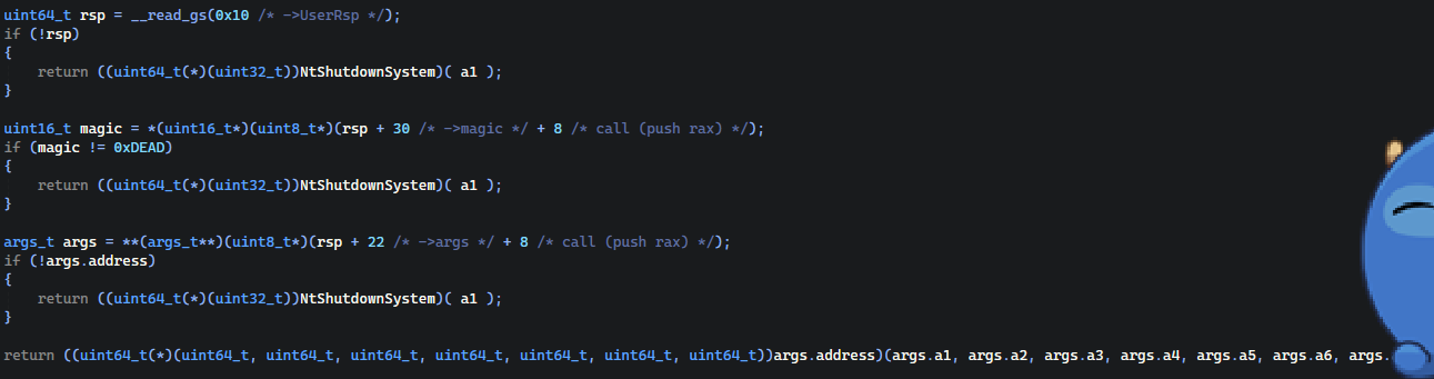 We are reading GS segment register of the CPU with offset that point to the ->UserRsp then we are getting the magic offset. Remember that we calling a call in usermode, call pushes 8 bytes for storing RAX on stack so we need to add it too. Then we are getting our hidden argument from RSP that is an pointer to the structure and in the end, we are executing our payload.