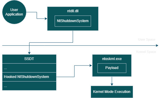 Then when we have the KiServiceTable to not make the syscall id hardcoded, we can walk the table searching for the NtShutdownSystem’s relative offset, as we have function address from EAT, we can find its entry there. Then just change the relative offset in the entry to point to our payload.