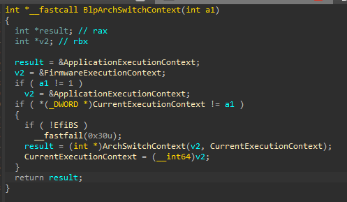 The task of BlpArchSwitchContext is to switch between Firmware (Physical Memory) and Application (Virtual Memory) execution contexts. It internaly switches the descriptor table context but we do not care about that.